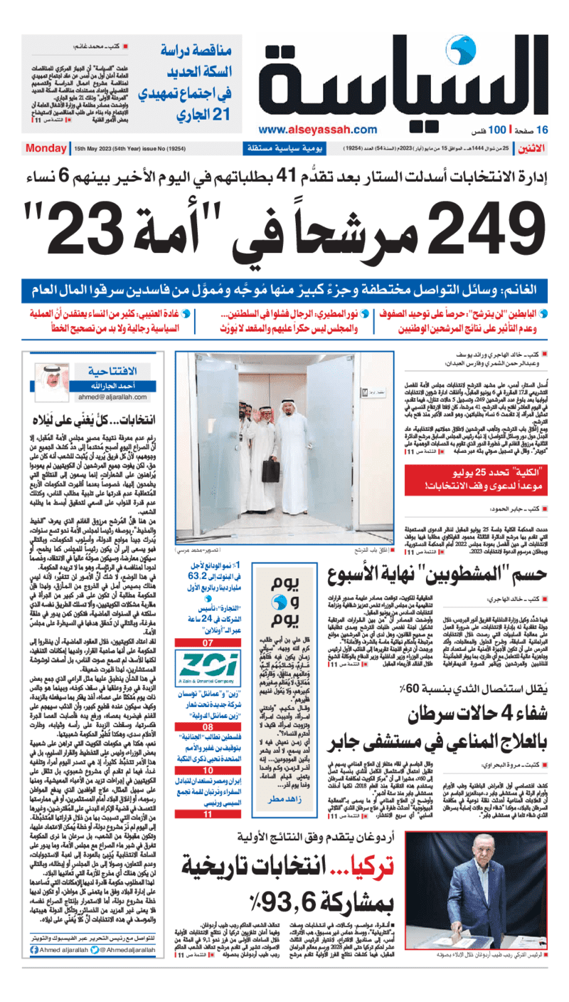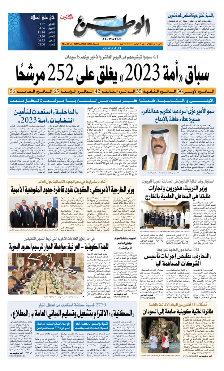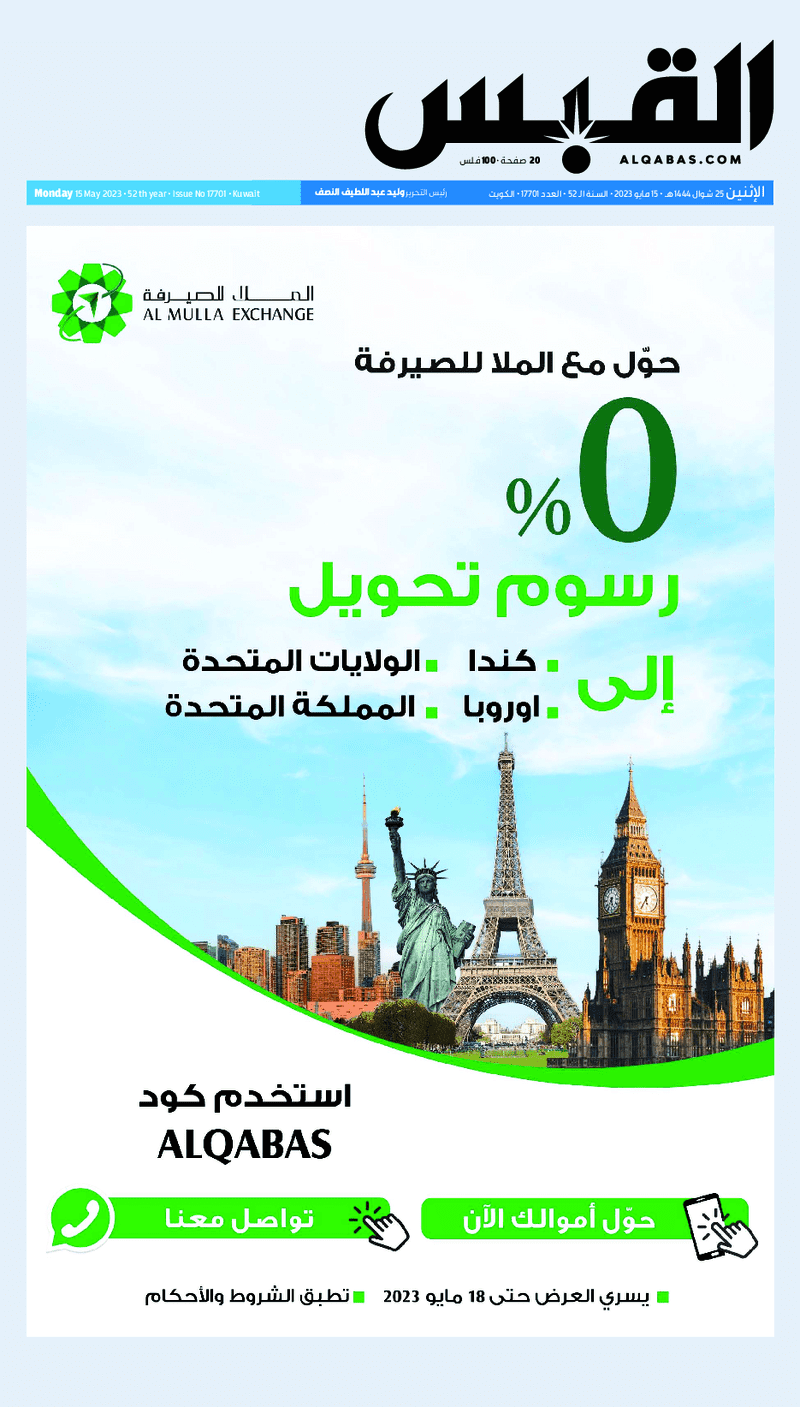 آخر الأخبار جرائم وقضايا “الجمارك” تضبط 29 ألف علبة مشروبات كحولية قادمة من دولة آسيوية في ميناء الشويخ 9 يونيو، 2024 محليات ممثلة عن دولة الكويت الطبيبة الكويتية أسماء الكندري تشارك في المؤتمر العالمي للمناظير في إيطاليا 8 يونيو، 2024 محليات “الصحة”: اكتمال وصول فريق الخدمات الطبية ببعثة الحج الكويتية لمكة المكرمة 8 يونيو، 2024 محليات “الصحة” تحدد 8 مراكز للصحة المدرسية لاستقبال الطلبة المبتعثين 8 يونيو، 2024 عربي وعالمي “الصحة العالمية”: تسجيل أول وفاة لشخص مصاب بـ«أنفلونزا الطيور» 7 يونيو، 2024 محليات عناوين الصحف الكويتية ليوم الاثنين 15 مايو 2023 محرر المحليات15 مايو، 2023أضف تعليق1 دقائق جريدة الأنباء جريدة القبس جريدة السياسة جريدة الوطن جريدة الصباح الوسومTop عناوين الصحف المحلية من الممكن أن يعجبك جرائم وقضايا “الجمارك” تضبط 29 ألف علبة مشروبات كحولية قادمة من دولة آسيوية في ميناء الشويخ محليات ممثلة عن دولة الكويت الطبيبة الكويتية أسماء الكندري تشارك في المؤتمر العالمي للمناظير في إيطاليا محليات “الصحة”: اكتمال وصول فريق الخدمات الطبية ببعثة الحج الكويتية لمكة المكرمة محليات “الصحة” تحدد 8 مراكز للصحة المدرسية لاستقبال الطلبة المبتعثين عربي وعالمي “الصحة العالمية”: تسجيل أول وفاة لشخص مصاب بـ«أنفلونزا الطيور» تكنولوجيا رش السحب بملح البحر.. تجربة “ثورية” لتبريد كوكب الأرض أضف تعليق أضغط هنا لإضافة تعليق إلغاء الردالتعليقالاسم البريد الإلكتروني الموقع الإلكتروني Δ هذا الموقع يستخدم خدمة أكيسميت للتقليل من البريد المزعجة. اعرف المزيد عن كيفية التعامل مع بيانات التعليقات الخاصة بك processed.