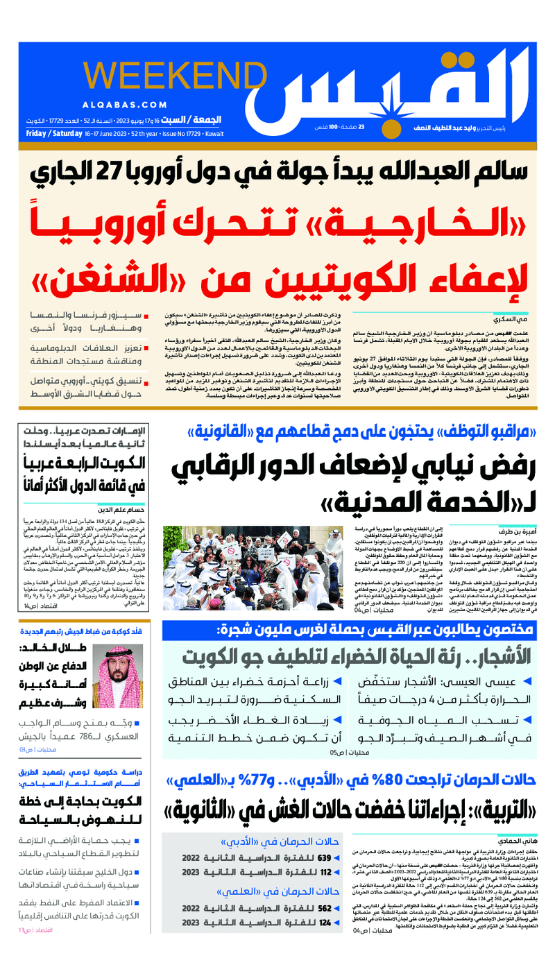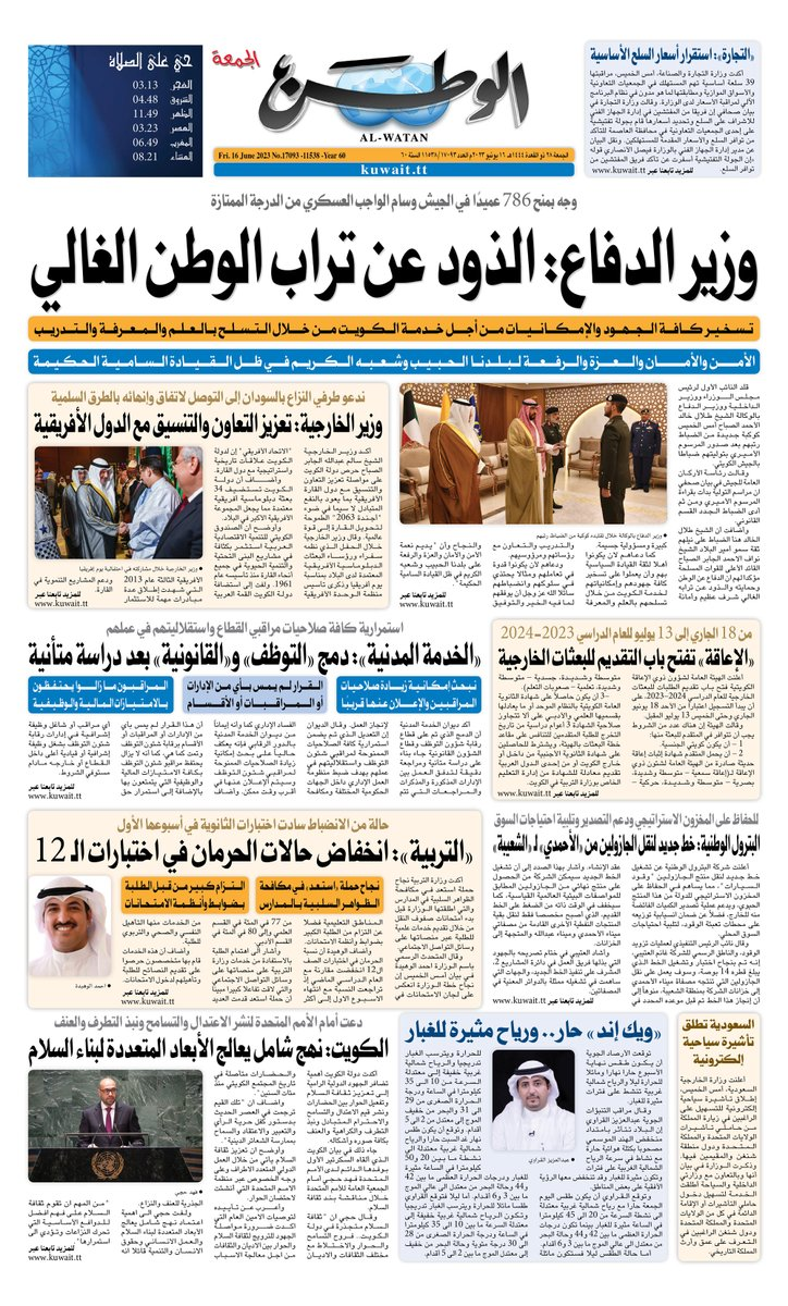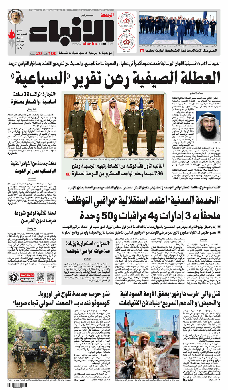 آخر الأخبار جرائم وقضايا “الجمارك” تضبط 29 ألف علبة مشروبات كحولية قادمة من دولة آسيوية في ميناء الشويخ 9 يونيو، 2024 محليات ممثلة عن دولة الكويت الطبيبة الكويتية أسماء الكندري تشارك في المؤتمر العالمي للمناظير في إيطاليا 8 يونيو، 2024 محليات “الصحة”: اكتمال وصول فريق الخدمات الطبية ببعثة الحج الكويتية لمكة المكرمة 8 يونيو، 2024 محليات “الصحة” تحدد 8 مراكز للصحة المدرسية لاستقبال الطلبة المبتعثين 8 يونيو، 2024 عربي وعالمي “الصحة العالمية”: تسجيل أول وفاة لشخص مصاب بـ«أنفلونزا الطيور» 7 يونيو، 2024 محليات عناوين الصحف الكويتية ليوم الجمعة 16 يونيو 2023 محرر المحليات16 يونيو، 2023أضف تعليق1 دقائق جريدة الأنباء جريدة القبس جريدة السياسة جريدة الوطن جريدة الصباح الوسومTop عناوين الصحف المحلية من الممكن أن يعجبك جرائم وقضايا “الجمارك” تضبط 29 ألف علبة مشروبات كحولية قادمة من دولة آسيوية في ميناء الشويخ محليات ممثلة عن دولة الكويت الطبيبة الكويتية أسماء الكندري تشارك في المؤتمر العالمي للمناظير في إيطاليا محليات “الصحة”: اكتمال وصول فريق الخدمات الطبية ببعثة الحج الكويتية لمكة المكرمة محليات “الصحة” تحدد 8 مراكز للصحة المدرسية لاستقبال الطلبة المبتعثين عربي وعالمي “الصحة العالمية”: تسجيل أول وفاة لشخص مصاب بـ«أنفلونزا الطيور» تكنولوجيا رش السحب بملح البحر.. تجربة “ثورية” لتبريد كوكب الأرض أضف تعليق أضغط هنا لإضافة تعليق إلغاء الردالتعليقالاسم البريد الإلكتروني الموقع الإلكتروني Δ هذا الموقع يستخدم خدمة أكيسميت للتقليل من البريد المزعجة. اعرف المزيد عن كيفية التعامل مع بيانات التعليقات الخاصة بك processed.