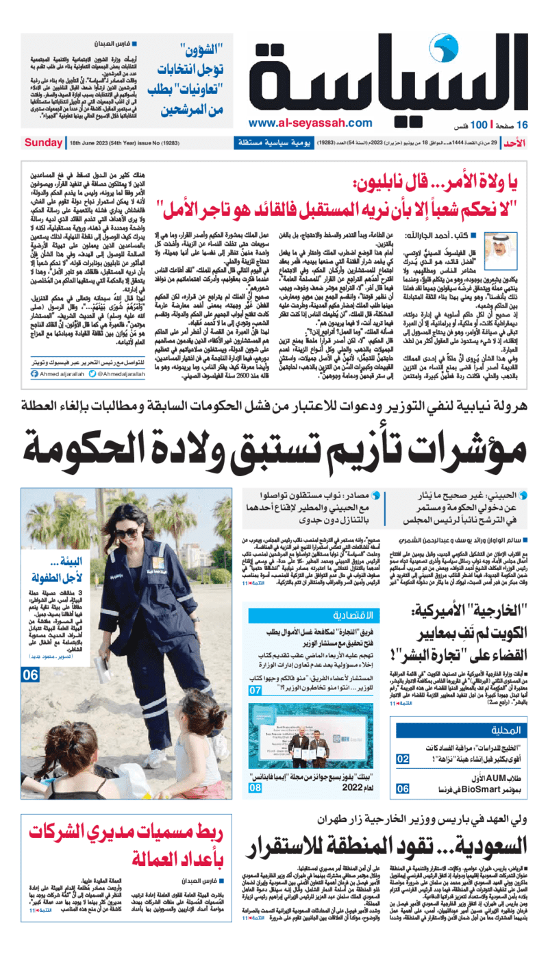 آخر الأخبار جرائم وقضايا “الجمارك” تضبط 29 ألف علبة مشروبات كحولية قادمة من دولة آسيوية في ميناء الشويخ 9 يونيو، 2024 محليات ممثلة عن دولة الكويت الطبيبة الكويتية أسماء الكندري تشارك في المؤتمر العالمي للمناظير في إيطاليا 8 يونيو، 2024 محليات “الصحة”: اكتمال وصول فريق الخدمات الطبية ببعثة الحج الكويتية لمكة المكرمة 8 يونيو، 2024 محليات “الصحة” تحدد 8 مراكز للصحة المدرسية لاستقبال الطلبة المبتعثين 8 يونيو، 2024 عربي وعالمي “الصحة العالمية”: تسجيل أول وفاة لشخص مصاب بـ«أنفلونزا الطيور» 7 يونيو، 2024 محليات عناوين الصحف الكويتية ليوم الأحد 18 يونيو 2023 محرر المحليات18 يونيو، 2023أضف تعليق1 دقائق جريدة الأنباء جريدة القبس جريدة السياسة جريدة الوطن جريدة الصباح الوسومTop عناوين الصحف المحلية من الممكن أن يعجبك جرائم وقضايا “الجمارك” تضبط 29 ألف علبة مشروبات كحولية قادمة من دولة آسيوية في ميناء الشويخ محليات ممثلة عن دولة الكويت الطبيبة الكويتية أسماء الكندري تشارك في المؤتمر العالمي للمناظير في إيطاليا محليات “الصحة”: اكتمال وصول فريق الخدمات الطبية ببعثة الحج الكويتية لمكة المكرمة محليات “الصحة” تحدد 8 مراكز للصحة المدرسية لاستقبال الطلبة المبتعثين عربي وعالمي “الصحة العالمية”: تسجيل أول وفاة لشخص مصاب بـ«أنفلونزا الطيور» تكنولوجيا رش السحب بملح البحر.. تجربة “ثورية” لتبريد كوكب الأرض أضف تعليق أضغط هنا لإضافة تعليق إلغاء الردالتعليقالاسم البريد الإلكتروني الموقع الإلكتروني Δ هذا الموقع يستخدم خدمة أكيسميت للتقليل من البريد المزعجة. اعرف المزيد عن كيفية التعامل مع بيانات التعليقات الخاصة بك processed.