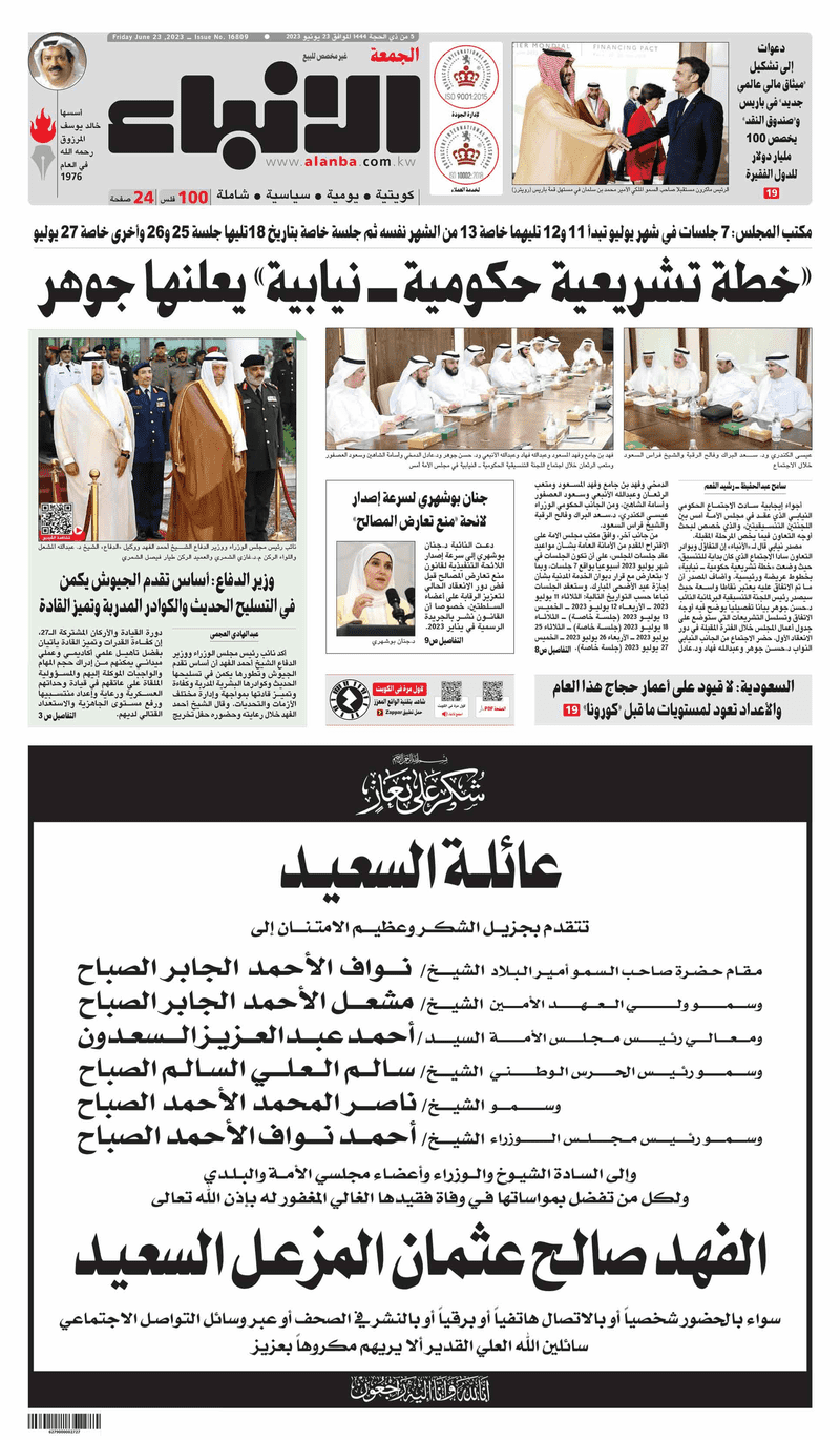 آخر الأخبار جرائم وقضايا “الجمارك” تضبط 29 ألف علبة مشروبات كحولية قادمة من دولة آسيوية في ميناء الشويخ 9 يونيو، 2024 محليات ممثلة عن دولة الكويت الطبيبة الكويتية أسماء الكندري تشارك في المؤتمر العالمي للمناظير في إيطاليا 8 يونيو، 2024 محليات “الصحة”: اكتمال وصول فريق الخدمات الطبية ببعثة الحج الكويتية لمكة المكرمة 8 يونيو، 2024 محليات “الصحة” تحدد 8 مراكز للصحة المدرسية لاستقبال الطلبة المبتعثين 8 يونيو، 2024 عربي وعالمي “الصحة العالمية”: تسجيل أول وفاة لشخص مصاب بـ«أنفلونزا الطيور» 7 يونيو، 2024 محليات عناوين الصحف الكويتية ليوم الجمعة 23 يونيو 2023 محرر المحليات23 يونيو، 2023أضف تعليق1 دقائق جريدة الأنباء جريدة القبس جريدة السياسة جريدة الوطن جريدة الصباح الوسومTop عناوين الصحف المحلية من الممكن أن يعجبك جرائم وقضايا “الجمارك” تضبط 29 ألف علبة مشروبات كحولية قادمة من دولة آسيوية في ميناء الشويخ محليات ممثلة عن دولة الكويت الطبيبة الكويتية أسماء الكندري تشارك في المؤتمر العالمي للمناظير في إيطاليا محليات “الصحة”: اكتمال وصول فريق الخدمات الطبية ببعثة الحج الكويتية لمكة المكرمة محليات “الصحة” تحدد 8 مراكز للصحة المدرسية لاستقبال الطلبة المبتعثين عربي وعالمي “الصحة العالمية”: تسجيل أول وفاة لشخص مصاب بـ«أنفلونزا الطيور» تكنولوجيا رش السحب بملح البحر.. تجربة “ثورية” لتبريد كوكب الأرض أضف تعليق أضغط هنا لإضافة تعليق إلغاء الردالتعليقالاسم البريد الإلكتروني الموقع الإلكتروني Δ هذا الموقع يستخدم خدمة أكيسميت للتقليل من البريد المزعجة. اعرف المزيد عن كيفية التعامل مع بيانات التعليقات الخاصة بك processed.