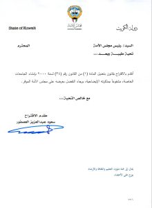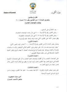 تقدم النائب سعود العصفور باقتراح بقانون بإنشاء الجامعات الخاصة ، بإنشاء جامعات خاصو أو كليات ومعاهد عليا خاصة أو فرع لجامعات أجنبية، لا تهدف للربح وتكون أغلبيو الأموال المشاركة في رأسمالها مملوكة للكويتيين”.