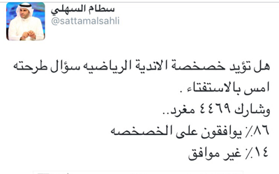 أجرى الصحفي سطام السهلي استفتاءً لمتابعيه على تويتر، حيث سألهم عن مشروع خصخصة الأندية الرياضية. واستمر الاستفتاء لمدة يوم واحد، وجاءت النتيجة بموافقة 86%، فيما...
