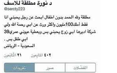 تدافع آلاف الخطاب من جنسيات مختلفة على طلب يد سيدة أعمال سعودية أعلنت عبر تويتر عن رغبتها في الارتباط بزوج تحبه ويقبل بشروطها. المرأة التي سمت نفسها بـ(د...
