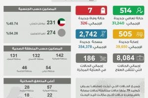 أعلنت وزارة الصحة الكويتية اليوم الأحد تعافي 514 إصابة بمرض (كوفيد-19) في دولة الكويت خلال الأربع وعشرين ساعة الماضية ليبلغ بذلك إجمالي عدد حالات الشفاء...