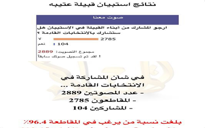 أظهرت نتائج استبيان في شأن المشاركة في الانتخابات القادمة لقبيلة عتيبة أن أكثر من 96% ممن يحق لهم لتصويت لن يشاركوا في انتخابات الصوت...
