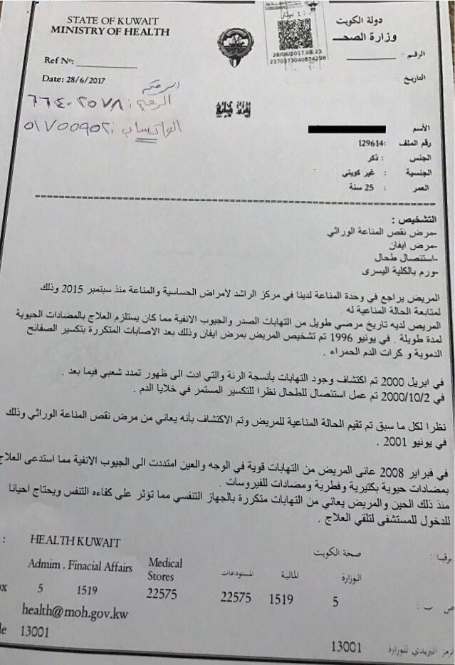 ناشد والدا شاب من المقيمين بصورة غير قانونية ” بدون ” أهل الخير والإحسان بأن يمدوا لهم يد العون والمساعدة وذلك للمساهمة في علاج ابنهم من مرض خطير...