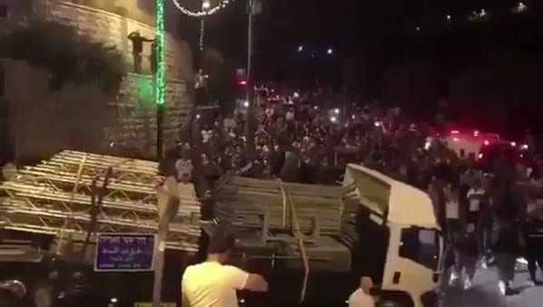 فيديو | احتفالات بين المعتصمين في #القدس بإزالة الاحتلال للبوابات الحديدية والكاميرات في باب الأسباط قبل قليل pic.twitter.com/G5GaBIlCnd — جريدة سبر...