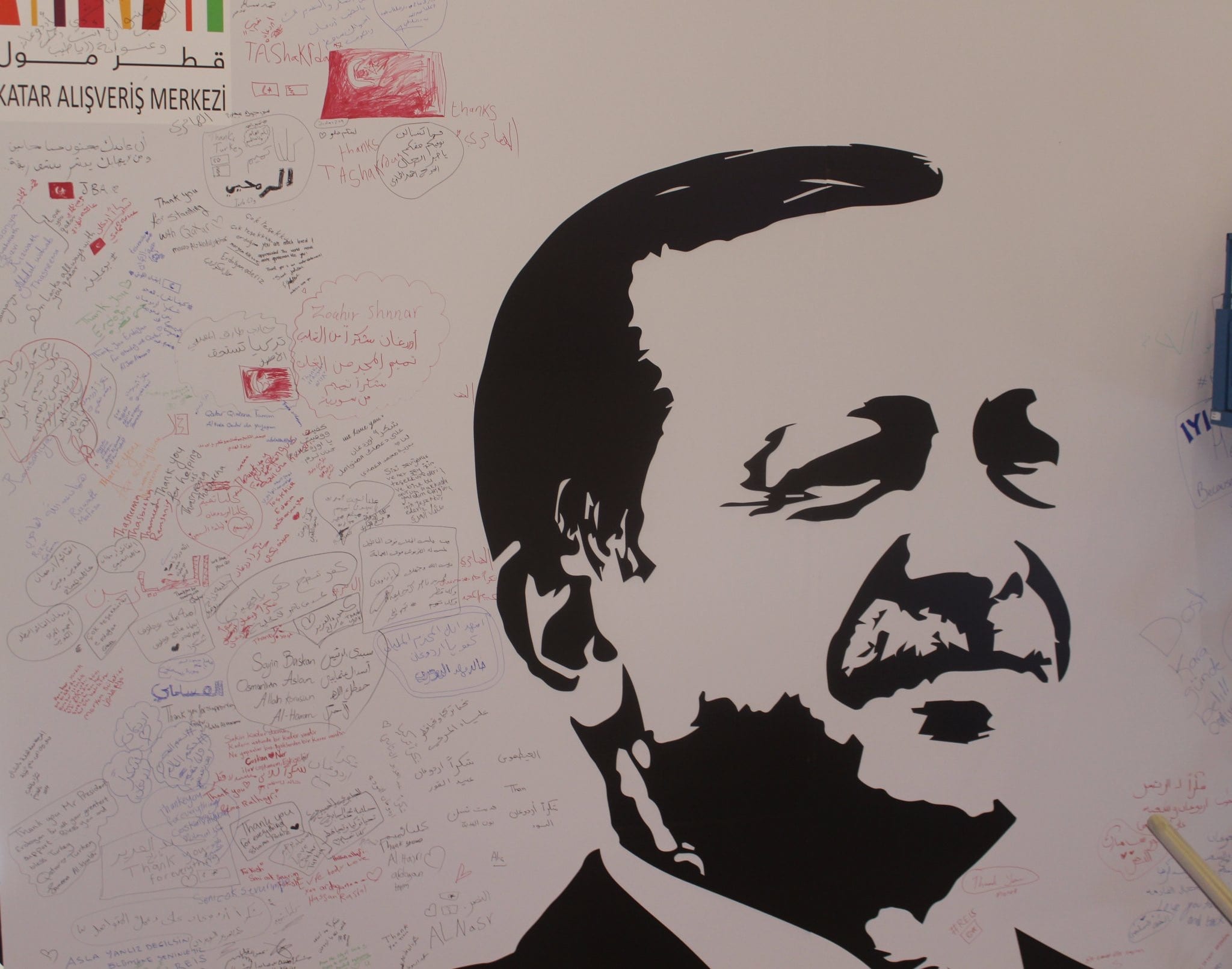 اختار قطريون في أحد المراكز التجارية بالعاصمة الدوحة، التعبير عن تقديرهم وشكرهم للرئيس التركي رجب طيب أردوغان، بإقامة جدارية عملاقة حملت صورته. وقام رواد وزوار...