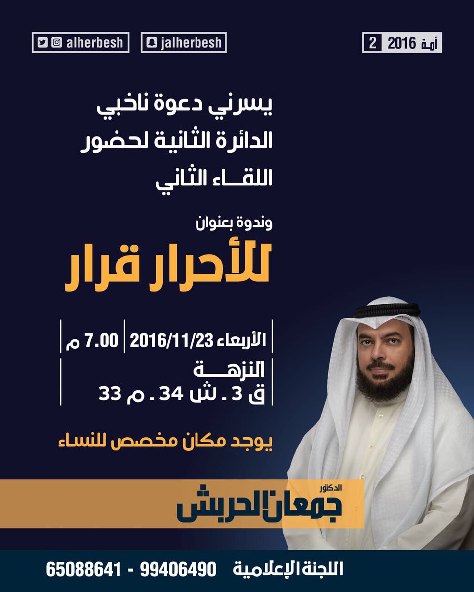 يقيم مرشح الدائرة الثانية النائب السابق د.جمعان الحربش اللقاء الثاني وندوة بعنوان تحت عنوان (للأحرار قرار) مساء اليوم الأربعاء الساعة السابعة والنصف مساء. وذلك...