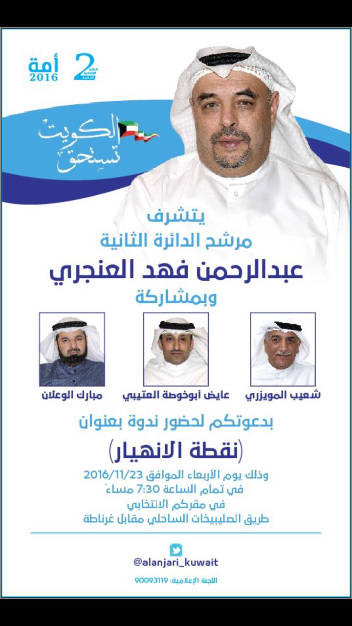 يقيم مرشح الدائرة الثانية النائب السابق عبدالرحمن العنجري ندوة في مقره الانتخابي بعنوان (نقطة الانهيار). ويتحدث في الندوة إضافة إلى العنجري كلا من شعيب...