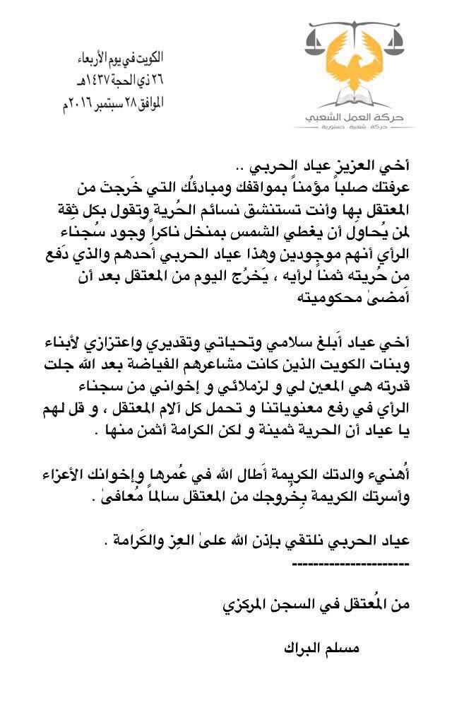رسالة مسلم البراك من معتقله لـ #عياد_الحربي