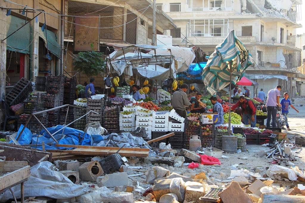 صورة وقصة| تجار ينتظرون الزبائن في سوق للخضار أقاموه بجانب المباني التي دمرتها الغارات الجوية على مدينة #حلب السورية