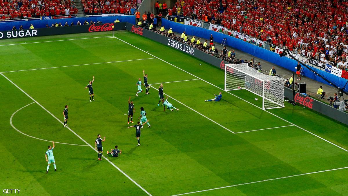 عادل مهاجم منتخب البرتغال لكرة القدم كريستيانو رونالدو رقم الفرنسي ميشال بلاتيني بتسجيله الهدف التاسع في النهائيات في مرمى ويلز في نصف نهائي كأس أوروبا 2016...