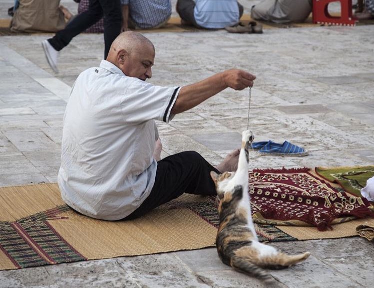 صورة وقصة| رجل يداعب قطة أثناء خطبة #عيد_الفطر في جامع الزيتونة بتونس.(وكالات)