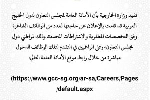 أفادت وزارة الخارجية بأن الأمانة العامة لمجلس التعاون لدول الخليج العربية قامت بالإعلان عن حاجتها لعدد من الوظائف الشاغرة وفق التخصصات المطلوبة والاشتراطات...